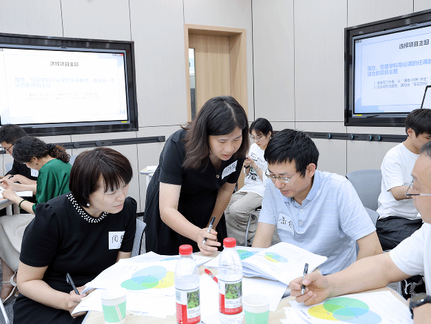 周凡吟、周利云两位培训师引导大家从当代学生的学习需求出发,结合课例观察,围绕智能时代的学生学习需求、场景化项目式学习、“3R”场景化项目式教学设计模型、场景化项目式教学设计的工作流程等四大模块,阐述了西财独创的“真问题-真过程-真成果”(3R)核心元素模型,并通过理论讲解、小组讨论、反馈指导等实践中,帮助参培教师系统掌握了3R模型的要义。在基于认识和理解3R模型的核心要义基础上,两位培训师以“数据可视化”课程为例,逐一分解“项目选题-设计3R-分解3R-设计教学过程-设计学习评价”5步工作流程。针对“项目选题”、“设计3R”两个关键、难点环节,组织老师们现场实操,分组反馈指导,有效助力大家对场景化项目式教学设计跨越从“知”到“行”的障碍。