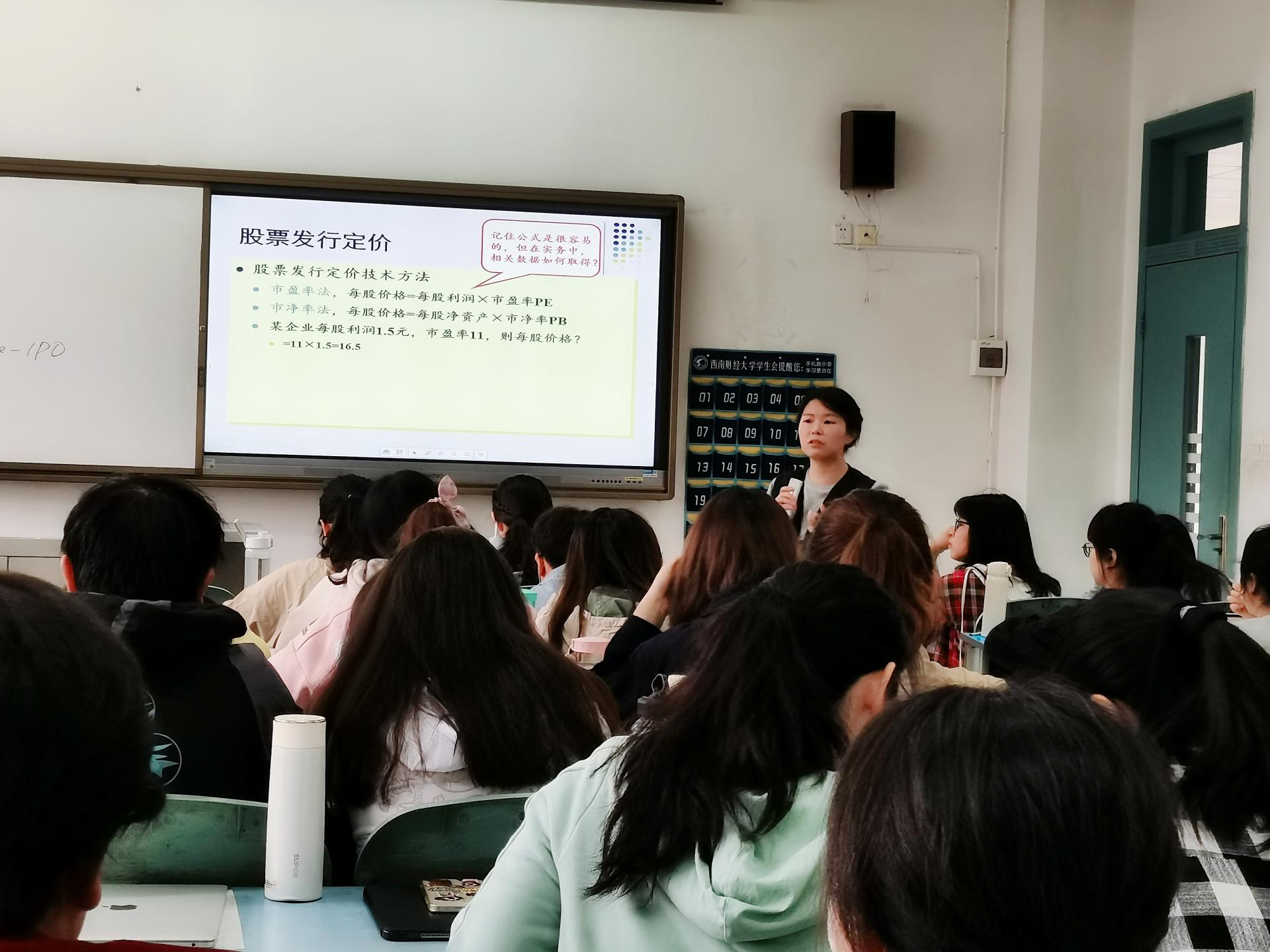 课上,吉老师聚焦“股票发行定价”问题,以市盈率法和市净率法为教学重点,结合实际案例,讲解在现实生活中如何应用理论知识对未上市的公司股票进行定价。在授课过程中,吉老师以疫情背景下的影院股票定价为例,就“如何计算每股利润”问题,与学生进行探讨,激发了学生的学习兴趣与自我反思。随后,她着重以“阿里巴巴估值”为案例,让学生以分析师或投资者身份思考如何确定参照物并进行同行比较,帮助学生进一步强化了知识点的内在逻辑和实际应用策略。最后,她引导学生对市盈率法和绝对估值法进行比较,强调解决现实财务问题的关键是信息收集和推理论证,定价方法不是唯一的。吉老师的课堂生动有趣、互动充分、详略得当,注重培养学生的综合能力和职业规划能力。