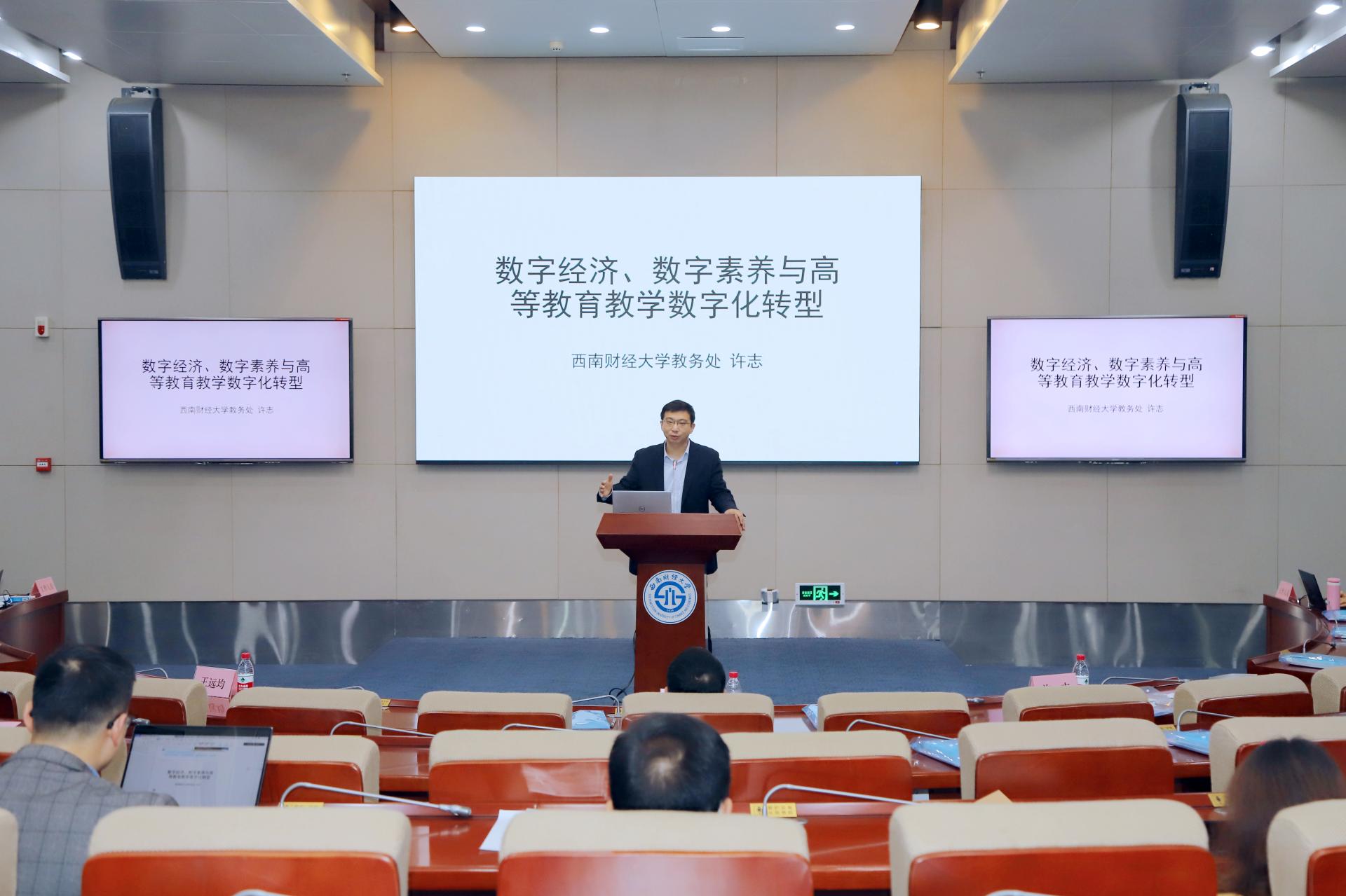 教务处副处长许志作“数字经济、数字素养与高等教育数字化转型”主题报告,从高等教育、院校、专业、课程教学、教师、学生及质量保障7个层面进行分享。