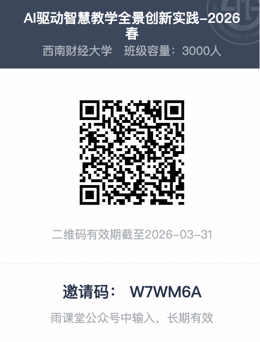 欢迎各教学单位对AI赋能课程教学改革的教师报名参加。请参培教师微信扫描下方二维码,加入“西南财经大学”雨课堂班级,然后按照上方表格的直播日程,自主选择感兴趣的场次参培。